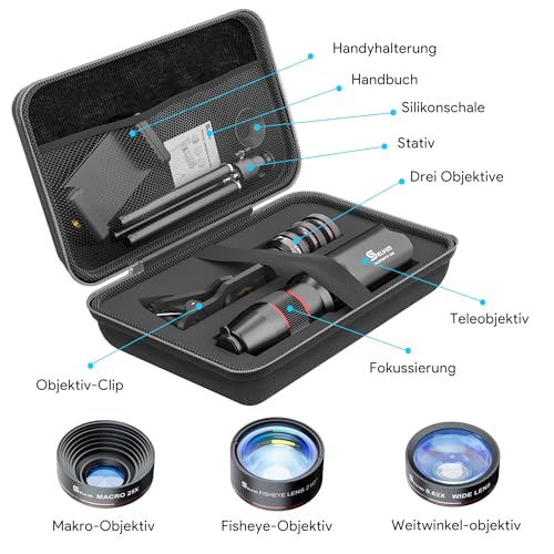 Das Handy Objektiv Linse Kit bietet Ihnen eine aktuelle Version mit einem 22X Teleobjektiv, einem 25X Makroobjektiv, einem 0,62X Weitwinkelobjektiv und einem 235° Fischaugenobjektiv. Mit einem Aluminiumlegierung-Stativ, einer Okularabdeckung, einem Reinigungstuch und einem Objektivclip ist dieses Set perfekt für die Aufnahme von Landschaften, Nahaufnahmen und kreativen Perspektiven. Ideal für Fotografen, die ihre Smartphone-Fotografie erweitern möchten!
