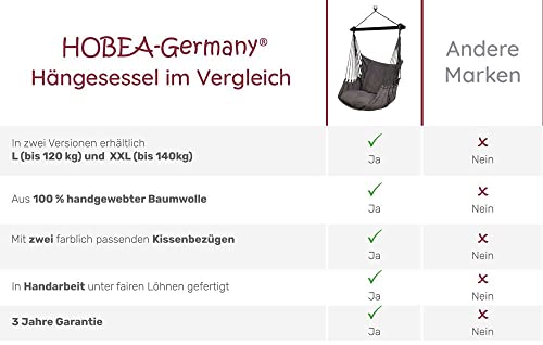 Der HOBEA-Germany Hängesessel ist ideal für drinnen und draußen. Mit zwei Kissen und einer stabilen Konstruktion bietet er Komfort und Stil. Perfekt für entspannte Stunden auf dem Balkon oder im Garten. Ein tolles Möbelstück für jedes Zuhause!