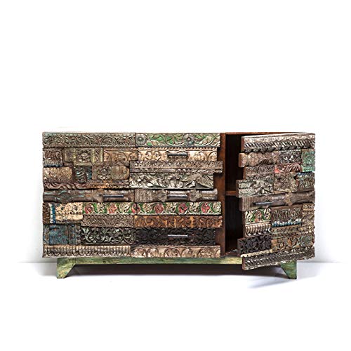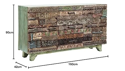 Dieses beeindruckende Sideboard bietet nicht nur viel Stauraum durch 2 Türen und 3 Schübe, sondern überzeugt auch mit seinen extravaganten handgeschnitzten Ornamenten. Mit den Maßen 90x160x42 cm ist es ideal für jeden Raum und bringt einen Hauch von Kunst und Kreativität in dein Zuhause. Perfekt für alle, die das Besondere lieben!
